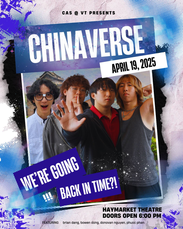 The Chinese American Society at Virginia Tech presents their annual culture show titled "Chinaverse" on Saturday, April 19, 2025 at Haymarket Theater inside the Squires Student Center on the campus of Virginia Tech.