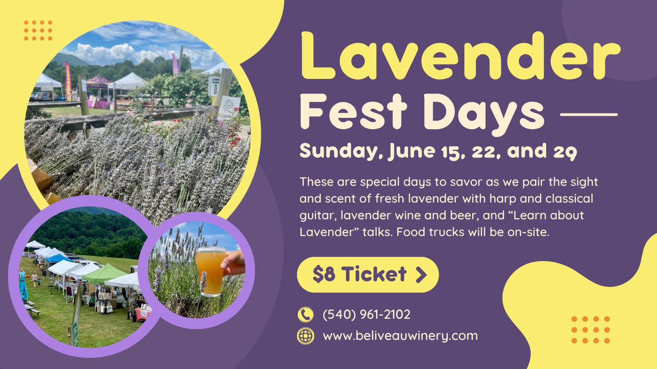 Beliveau Farm Winery presents the 17th annual Lavender Fest Days Festival held over three Sunday dates starting on Sunday, June 15, 2025 through Sunday, June 29, 2025.