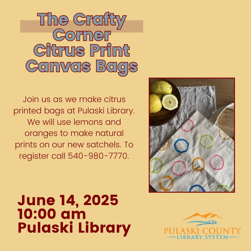 The Pulaski County Library continues their monthly The Crafty Corner series for June with the theme "Citrus Print Canva Bags" on Saturday, June 14, 2025.