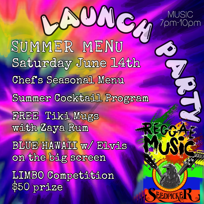Celebrate the launch of their new summer menu featuring the chef's seasonal menu and summer cocktail program. There will be a Limbo Competition with a $50 prize for the winner. Seedpicker will perform reggae from 7-10 PM.