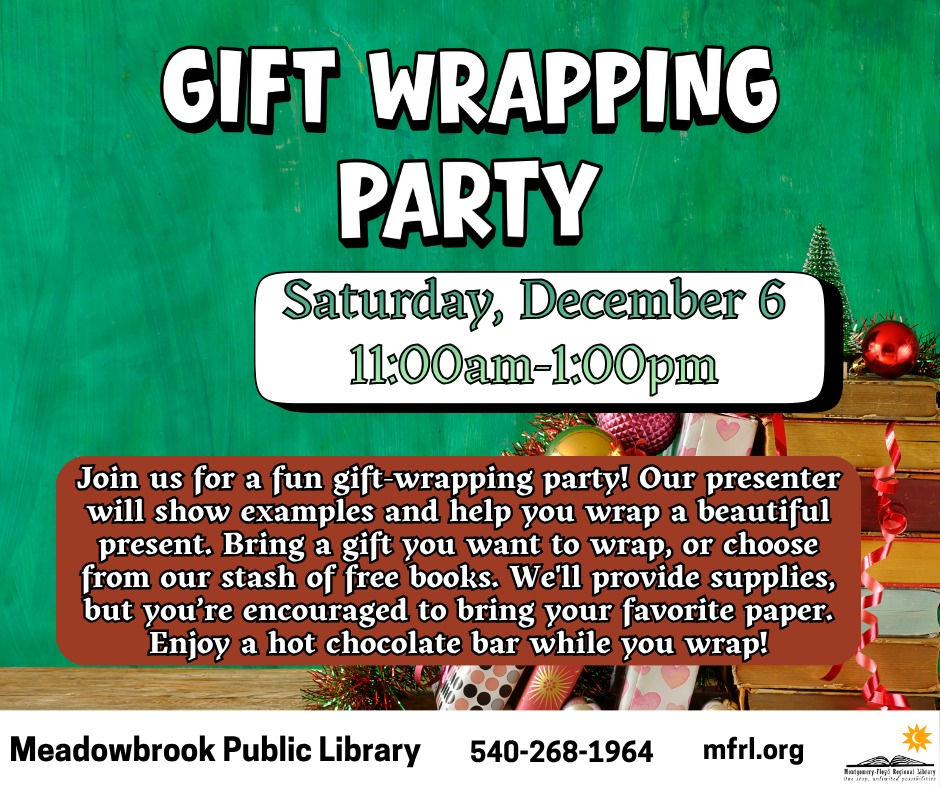 The Meadowbrook Public Library presents a Gift Wrapping Party on Saturday, December 6, 2025.