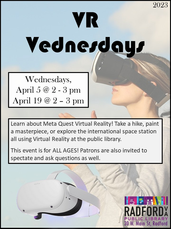 Radford Public Library presents VR Vednesdays on Wednesday, April 19, 2023.