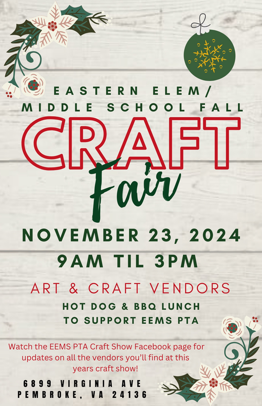 Eastern Elementary/Middle School presents their 2024 PTA Fall Craft Show on Saturday, November 18, 2023.