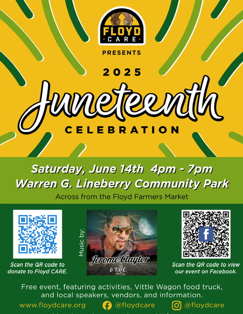 Floyd Care presents the 2025 Floyd Juneteenth Celebration on Saturday, June 14, 2025 at Warren G. Lineberry Memorial Park.