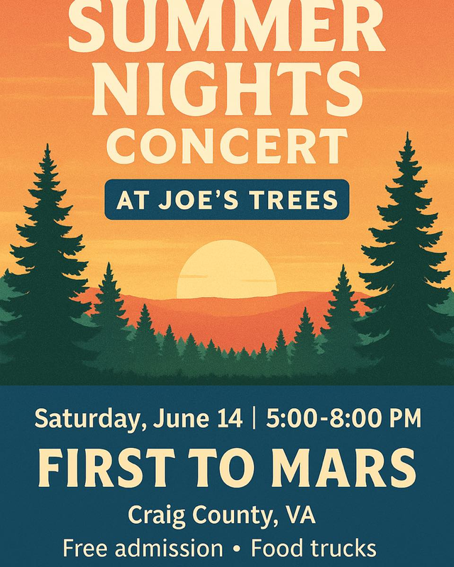 Joe's Trees presents Summer Nights Concert with First to Mars on Saturday, June 14, 2025.