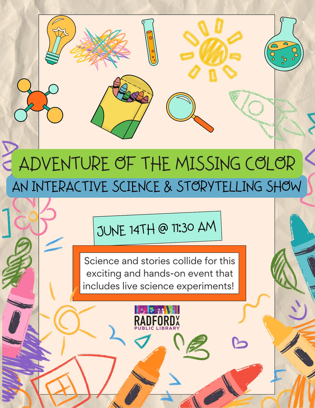The Radford Public Library presents An Interactive Science & Storytelling Show titled "Adventure Of The Missing Color" on Saturday, June 14, 2025.