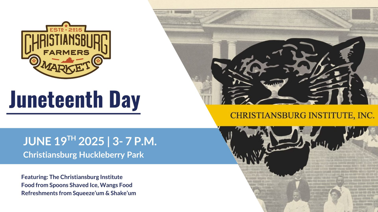 The Christiansburg Farmers Market presents their Juneteenth Day Weekly Market on Thursday, June 19, 2025 at Huckleberry Park's Playground Pavilion.