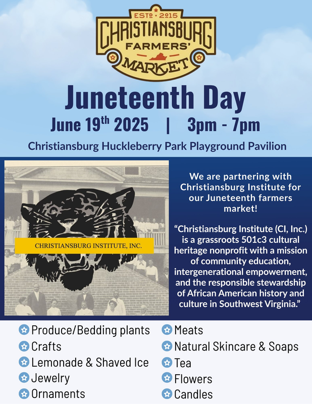 This week we are partnering with Christiansburg Institute for Juneteenth Day at the Market! Our vendors this week will have produce, meats, sourdough bread, baked goods, tea, natural skin care & soaps, handmade crafts, jewelry, candles, flowers, and delicious food & refreshments. There will be food available for purchase from Spoons Shaved Ice and Wangs Food and refreshments from Squeeze'um and Shake'um.