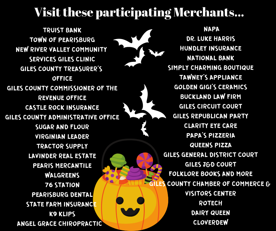 The Pearisburg Merchants Association presents the 8th Annual Downtown Pearisburg Trick or Treat Trail on Monday, October 31, 2022 in downtown Pearisburg, VA.