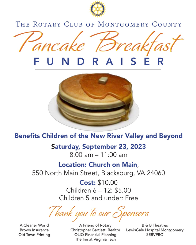 Join the Montgomery County Rotary Club in aiding 'Children of the 'New River Valley and Beyond'. Attend our Pancake Breakfast Fundraiser event to make a difference. We look forward to seeing you there!