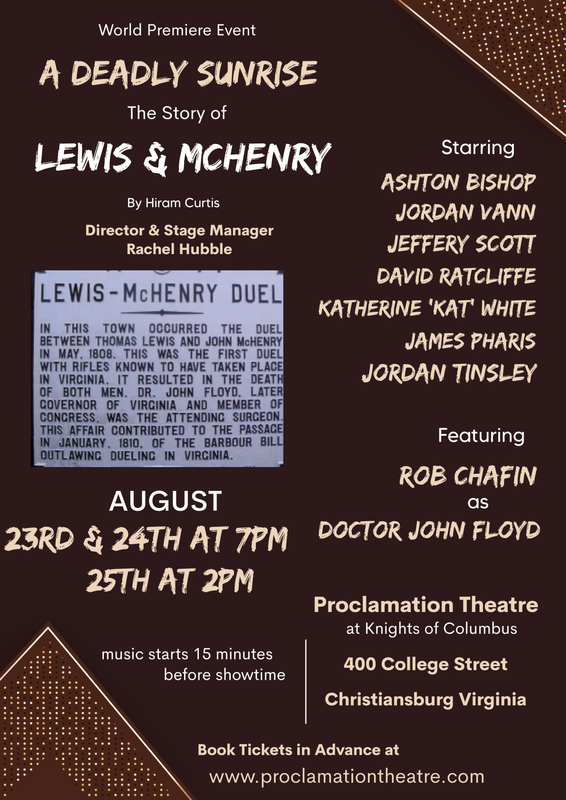 Proclamation Theatre and New River Stage presents the play "A Deadly Sunrise, the story of Lewis & McHenry" with three performances starting on Friday, August 23, 2024 through Sunday, August 25, 2024 at the Knights of Columbus Hall in Christiansburg, VA.