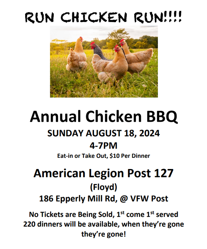 The American Legion Post 127 (Floyd) presents their 2024 Chicken BBQ Dinner Fundraiser on Sunday, August 18, 2024 at the VFW Post 7854 Floyd, Virginia.