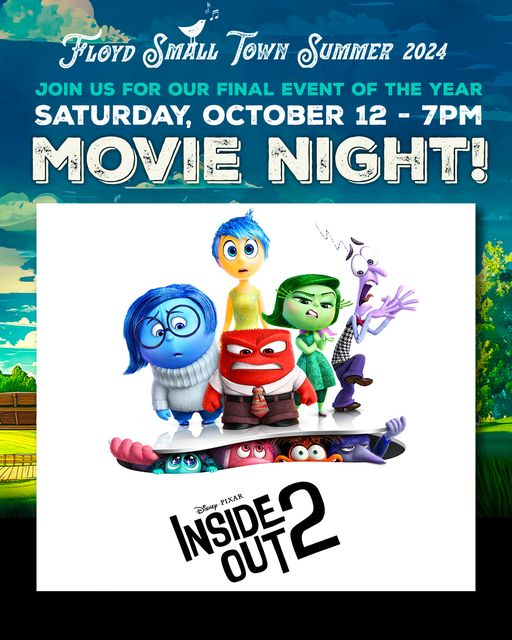 Floyd Small Town Summer wraps up their 2024 Movie Nights with "Inside Out 2" on Saturday, October 12, 2024 at Warren G. Lineberry Memorial Park in Floyd, VA.