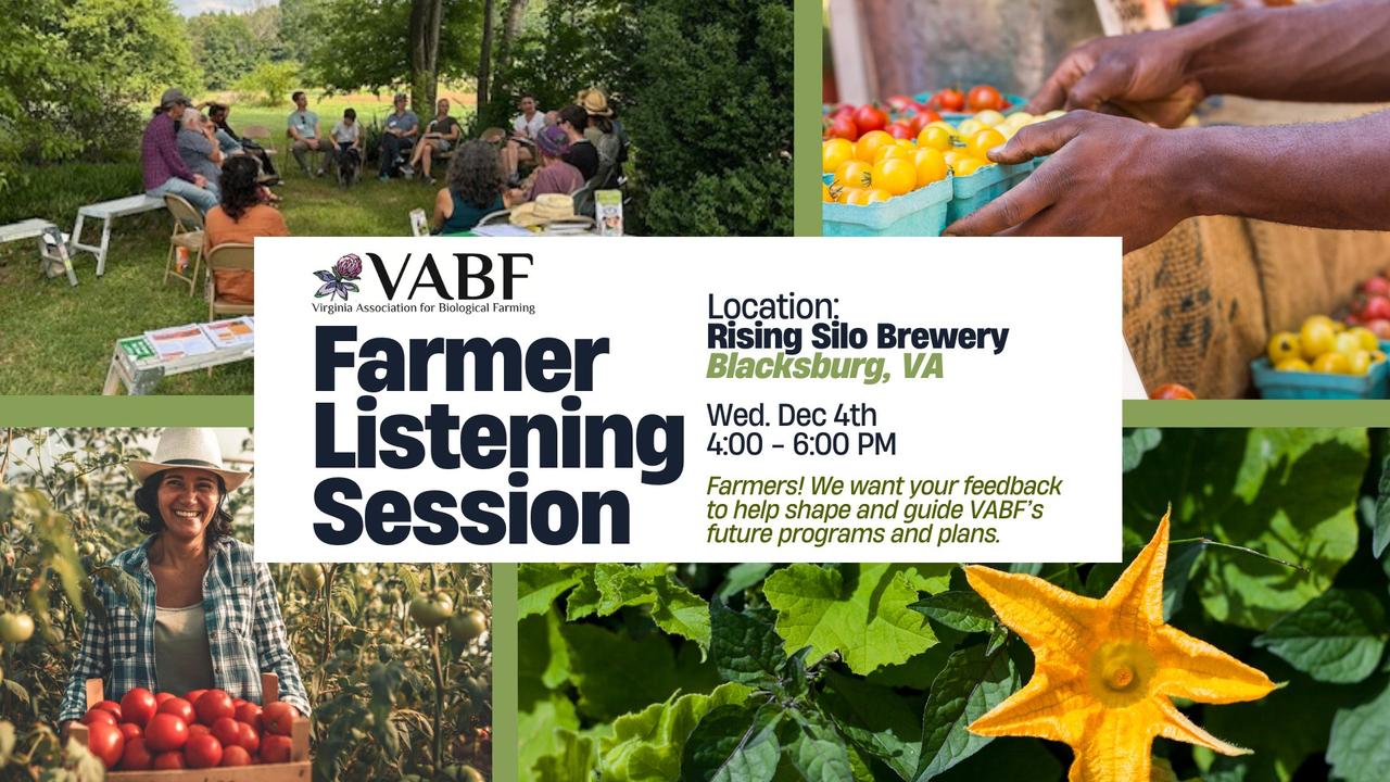 Virginia Association for Biological Farming presents a Farmer Listening Session on Wednesday, December 4, 2024 at Rising Silo Farm Brewery in Blacksburg, VA.