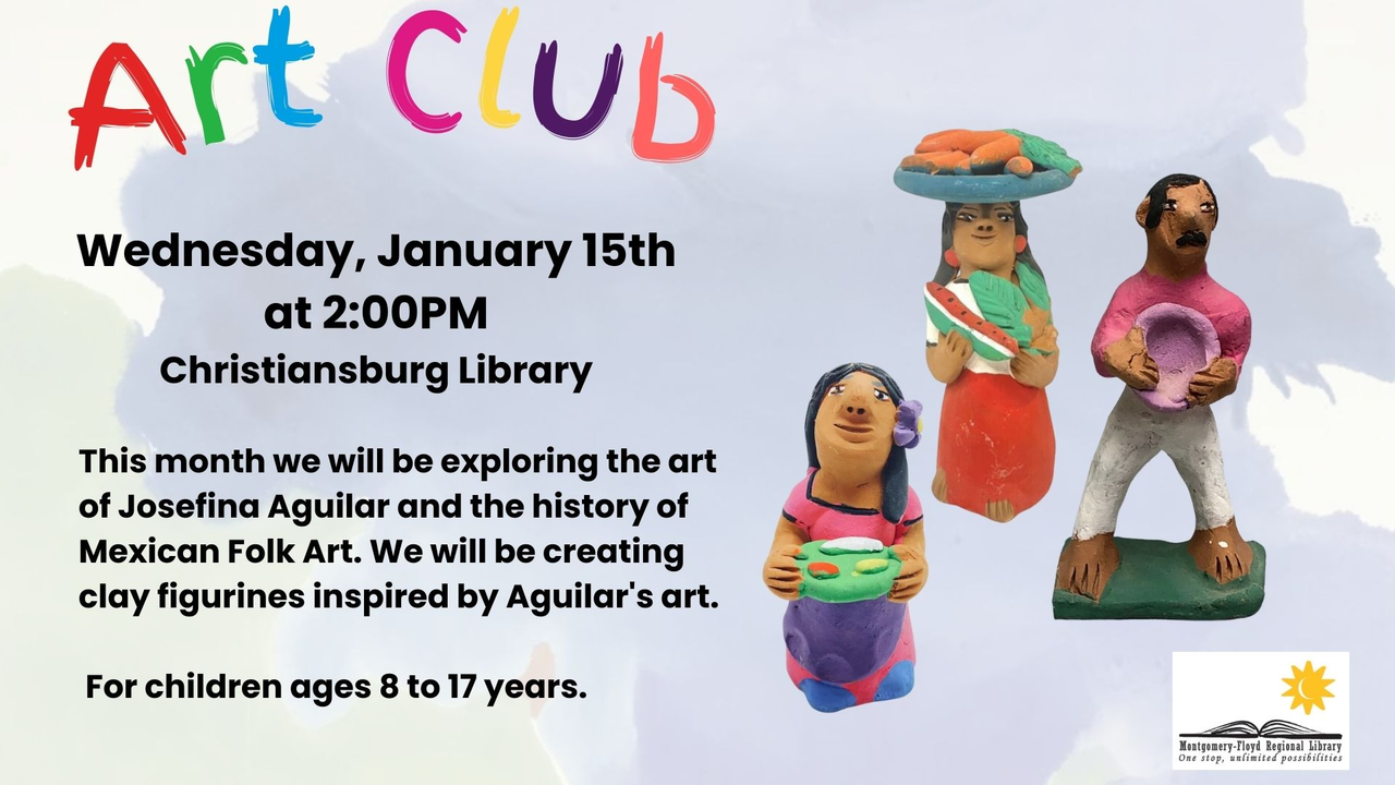 Christiansburg Library presents their Art Club with the theme Josefina Aguilar & Mexican Folk Art on Wednesday, January 15, 2025.