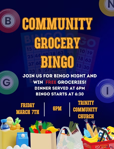 Trinity Community Church presents Community Grocery Bingo Night with Dinner on Friday, March 7, 2025.