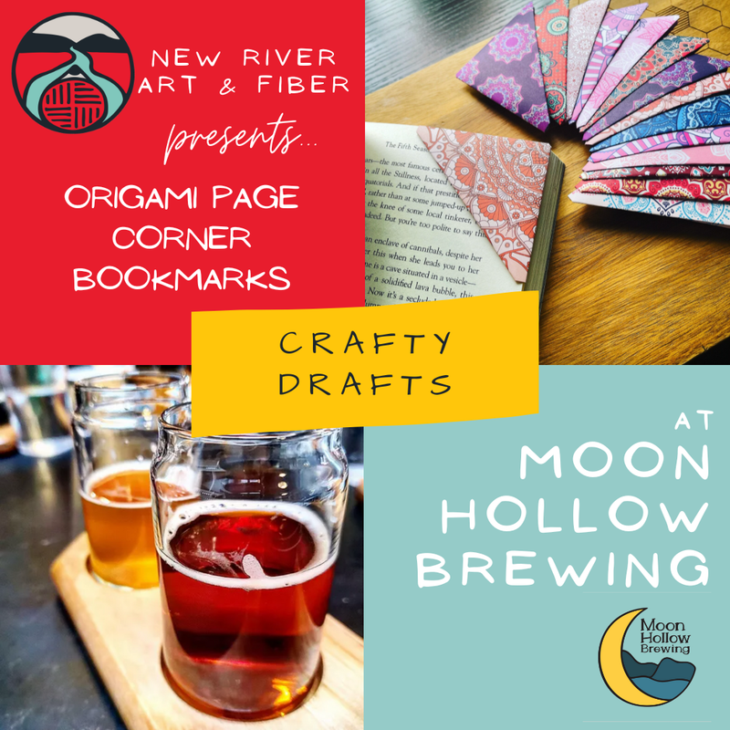 Moon Hollow Brewing presents September's Crafty Drafts with New River Art & Fiber creating "Origami Page Corner Bookmarks" on Thursday, September 11, 2025.