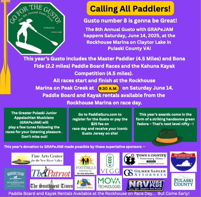 Competitors can register online at https://paddleguru.com/races/The8thAnnualGustowithGRAPeJAM or by calling 540-577-5917 and ask for the Gusto or on the morning of the event if you arrive early.