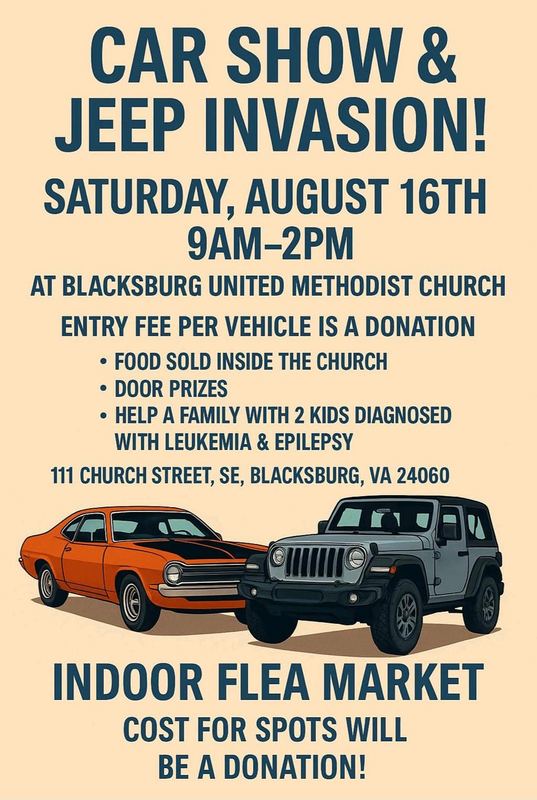 A Car Show & Jeep Invasion with an Indoor Flea Market will be held on Saturday, August 16, 2025 at Blacksburg United Methodist Church.