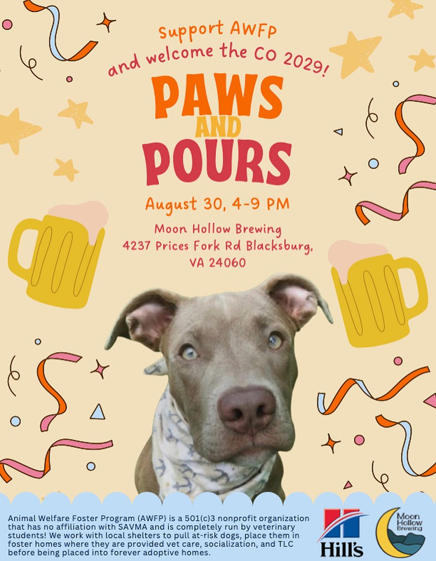Help welcome the Virginia Maryland College of Veterinary Medicine Class of 2029! A portion of every pint sold from 4:00-9:00 PM will be donated to the Animal Welfare Foster Program (AWFP) to continue their mission of saving dogs and cats in our community.
