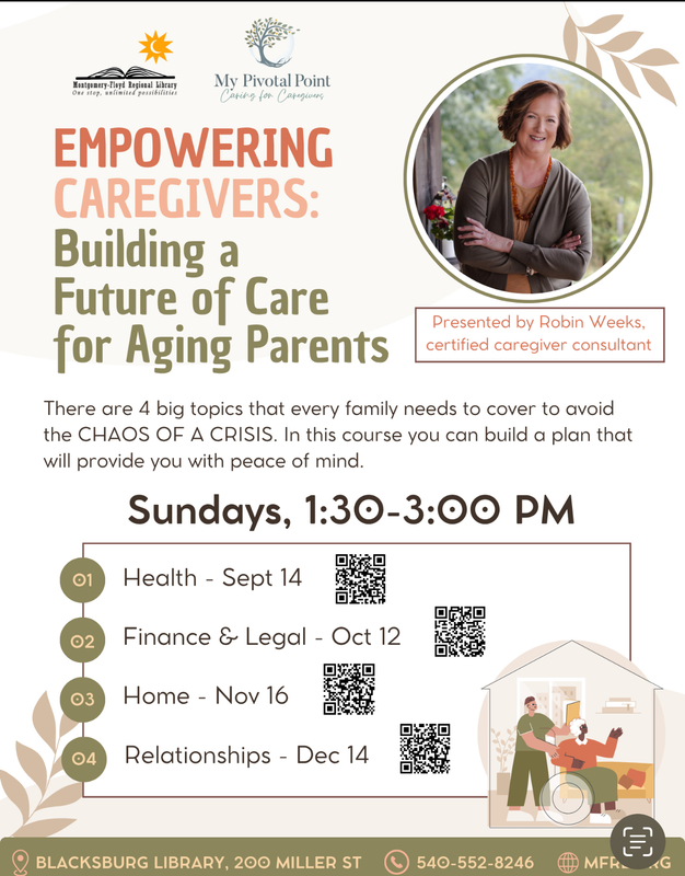 The Blacksburg Library presents the program and Session 4 of "Empowering Caregivers: Building a Future of Care for Aging Parents" with the topic "Relationships" on Sunday, December 14, 2025.