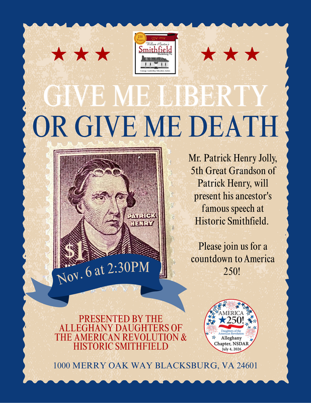 Historic Smithfield presents "Give Me Liberty or Give Me Death": A Reading by Patrick Henry Jolly (Descendant of Patrick Henry) on Thursday, November 6, 2025.