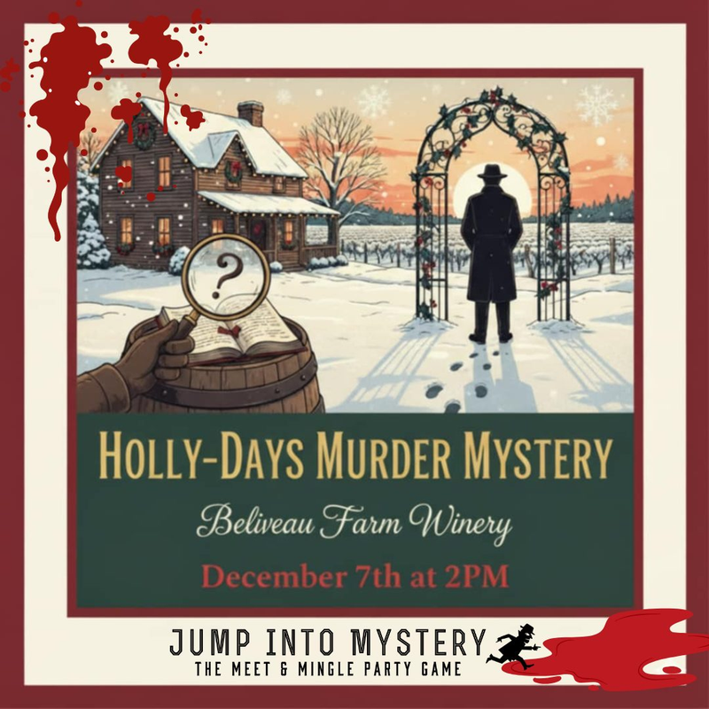 Jump Into Mystery presents a murder mystery titled "Deadly Holly-Days" on Sunday, December 7, 2025 at Beliveau Farm Winery in Blacksburg, VA.