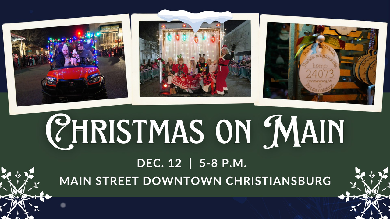 The Town of Christiansburg and Christiansburg Parks & Rec presents their annual Christmas on Main event on Friday, December 12, 2025 at various locations in downtown Christiansburg, VA.