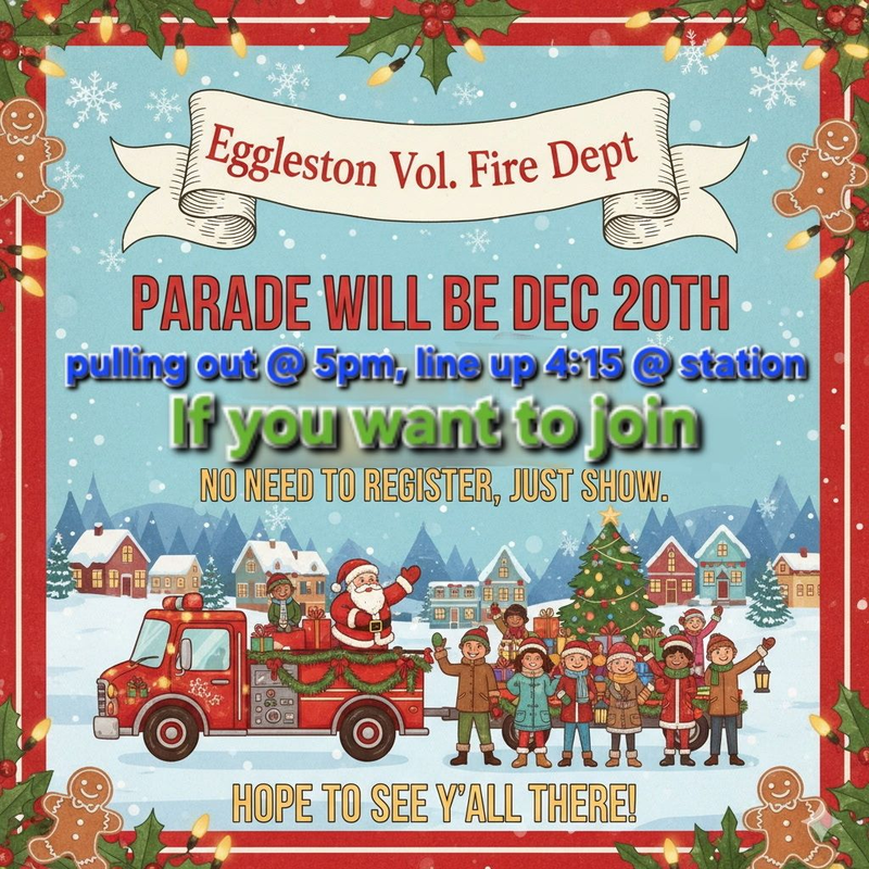 The Eggleston Volunteer Fire Department presents the 2025 Eggleston Christmas Parade on Saturday, December 20, 2025 with the parade line-up at the fire department.