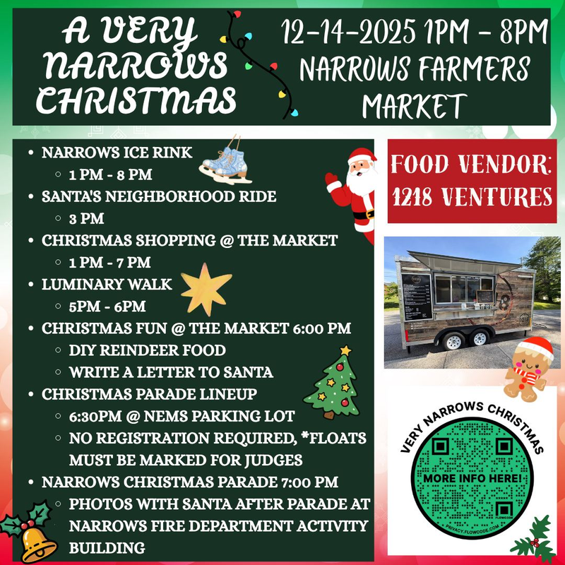 Narrows Park Commission and Narrows Farmers Market presents the 6th Annual "A Very Narrows Christmas" on Sunday, December 14, 2025 with most events centered at the Narrows Farmers Market.
