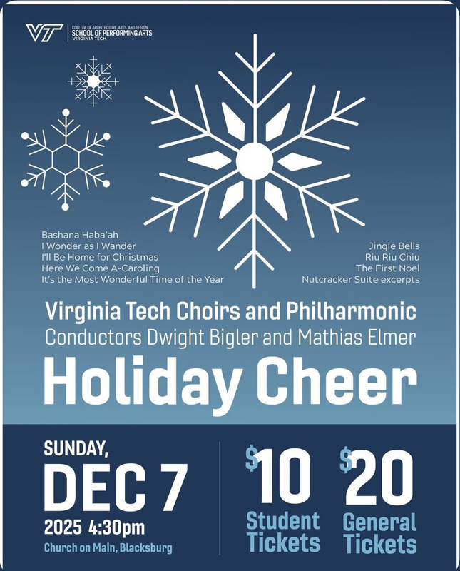 The Virginia Tech School of Performing Arts presents the Virginia Tech Choirs and Philharmonic perform the concert "Holiday Cheer" on Sunday, December 7, 2025 at the Church on Main in Blacksburg, VA.