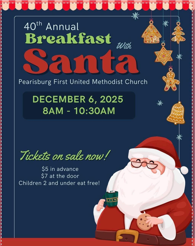 The Pearisburg Junior Women's Club presents their 40th Annual Breakfast with Santa on Saturday, December 6, 2025 at Pearisburg First United Methodist Church.