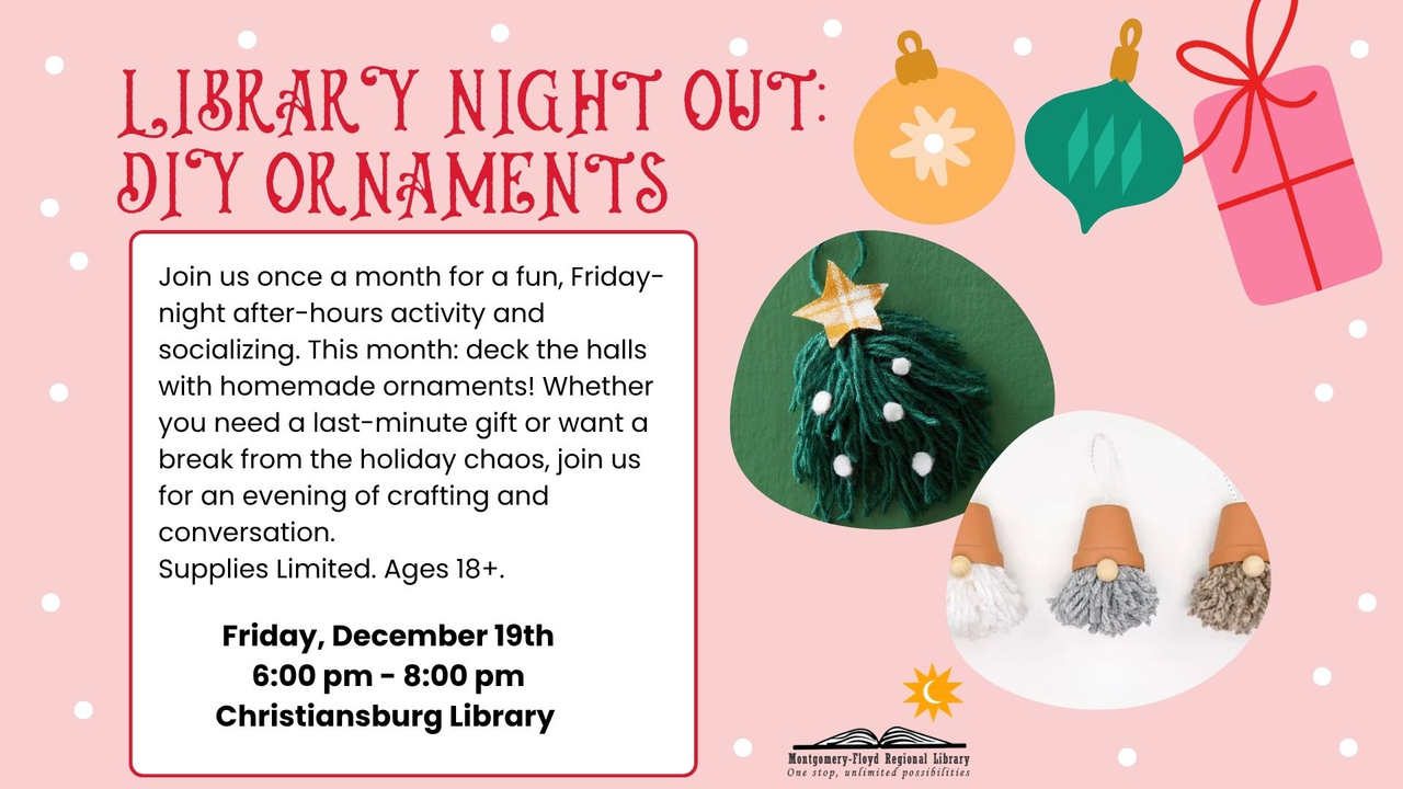 The Christiansburg Library continues their Library Night Out series with an event titled "DIY Ornaments" for adults on Friday, December 19, 2025.