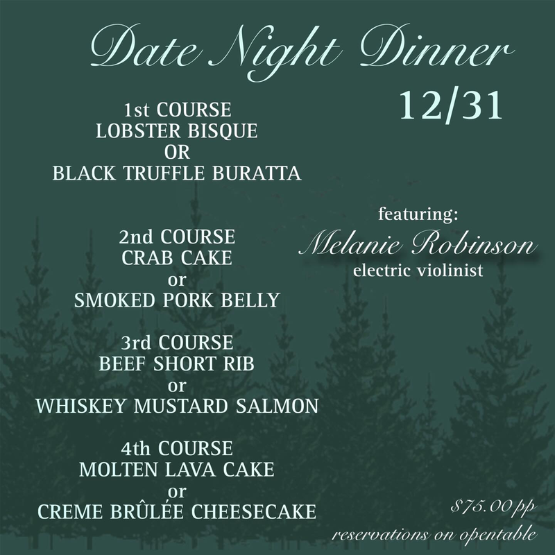 Enjoy a special Four-Course elegant Chef's Dinner and a live music performance by electric violinist Melanie Robinson on the second biggest date night of the year!
