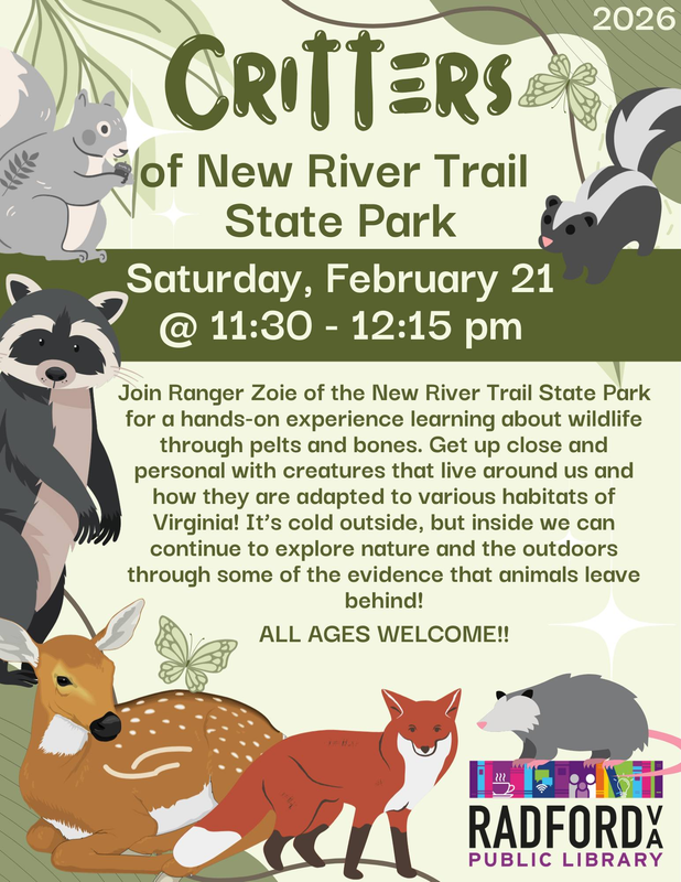 The Radford Public Library presents the program "Critters of New River Trail State Park" on Saturday, February 21, 2026.