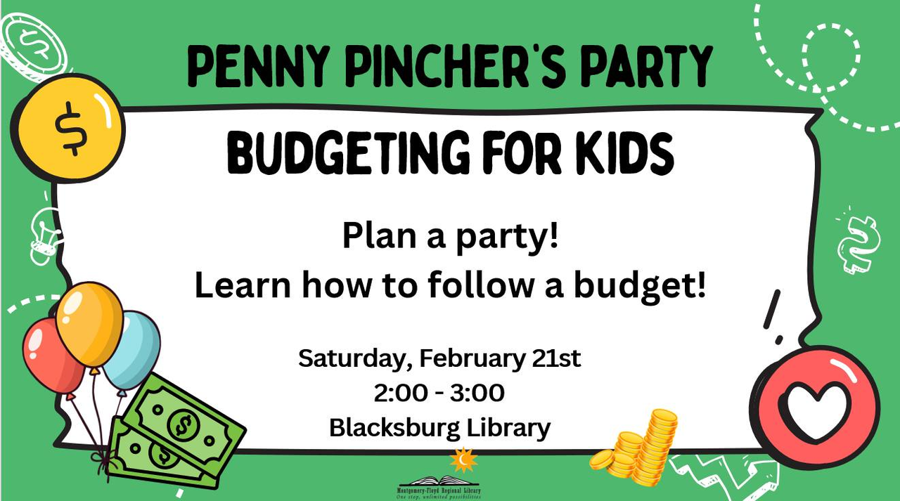 The Blacksburg Library presents the program "Penny Pincher's Party: Budgeting for Kids" on Saturday, February 21, 2026.