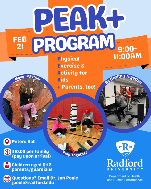The Radford University Department of Health and Human Performance presents Peak+ Program for Kids & Families on Saturday, February 21, 2026 at Peter's Hall on the campus of Radford University.