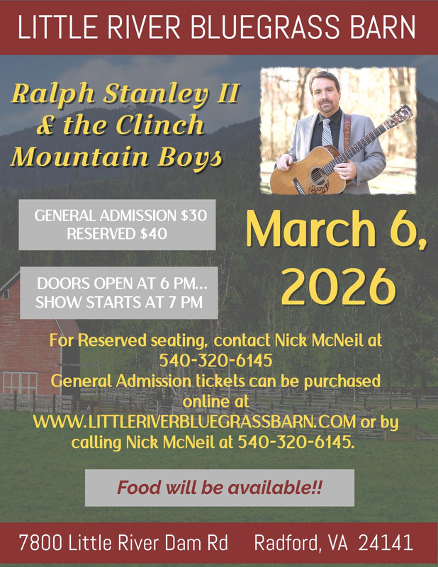 To purchase tickets general admission tickets online, visit: https://www.littleriverbluegrassbarn.com/events/ralph-stanley-ii-the-clinch-mountain-boys (scroll down) or call Nick McNeil at 540-320-6145 for reserved seating.
