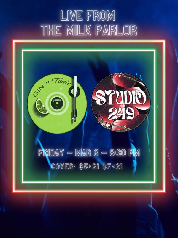 The Milk Parlor presents a Two Band Concert with Gin 'N Tonic and Studio 249 on Friday, March 6, 2026.