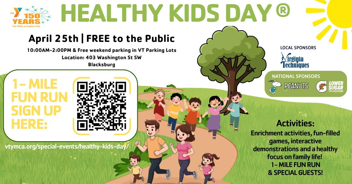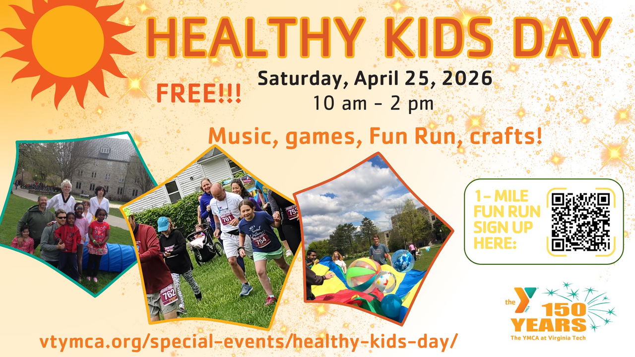 The YMCA at Virginia Tech presents the Annual Healthy Kids Day on Saturday, April 25, 2026 centered around The Lancaster House in Blacksburg, VA.