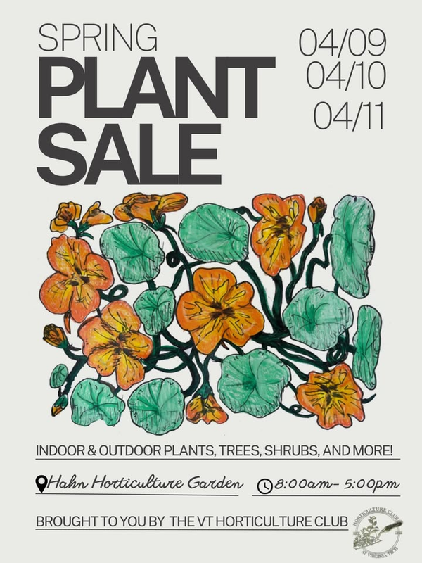 The Horticulture Club at Virginia Tech presents their annual three-day 2026 Hahn Garden Spring Plant Sale at the Hahn Horticulture Garden on the campus of Virginia Tech starting on Thursday, April 9, 2026 through Saturday, April 11, 2026 outside the Hahn Horticulture Garden on the campus of Virginia Tech.