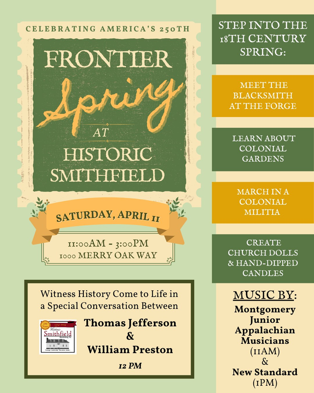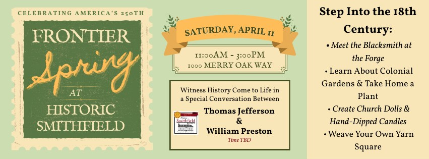 Step back in time and experience life on Virginia’s colonial frontier at Historic Smithfield’s 2026 season opener! Our “Frontier Spring in 1776” celebration invites the community to explore the daily life, work, and crafts of families living in Southwest Virginia during the Revolutionary era.