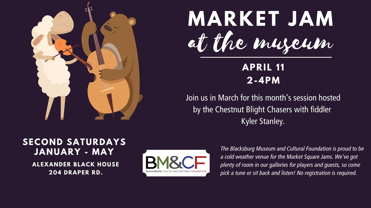 The Blacksburg Museum and Cultural Foundation continues their April Market Jam at the Museum series on Saturday, April 11, 2026 at the Alexander Black House.