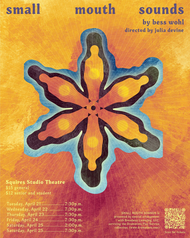 The Virginia Tech School of Performing Arts presents the play "Small Mouth Sounds" with six performances starting on Tuesday, April 21, 2026 through Saturday, April 25, 2026 inside the Squires Studio Theatre on the campus of Virginia Tech.