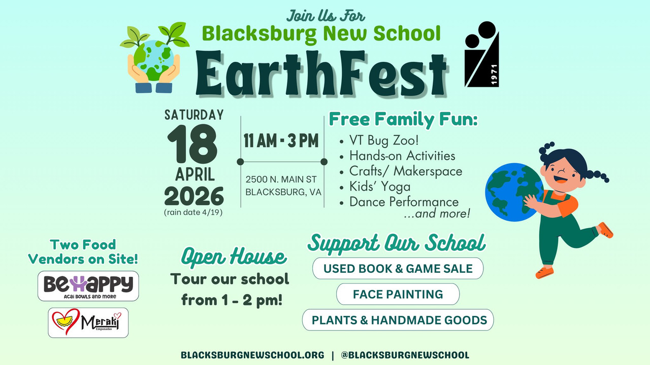 For more information, visit: https://www.blacksburgnewschool.org/earthday or https://www.facebook.com/blacksburgnewschool or call 540-552-6693.