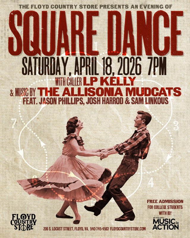 The Floyd Country Store presents An Evening of Square Dance with The Allisonia Mudcats on Saturday, April 18, 2026.