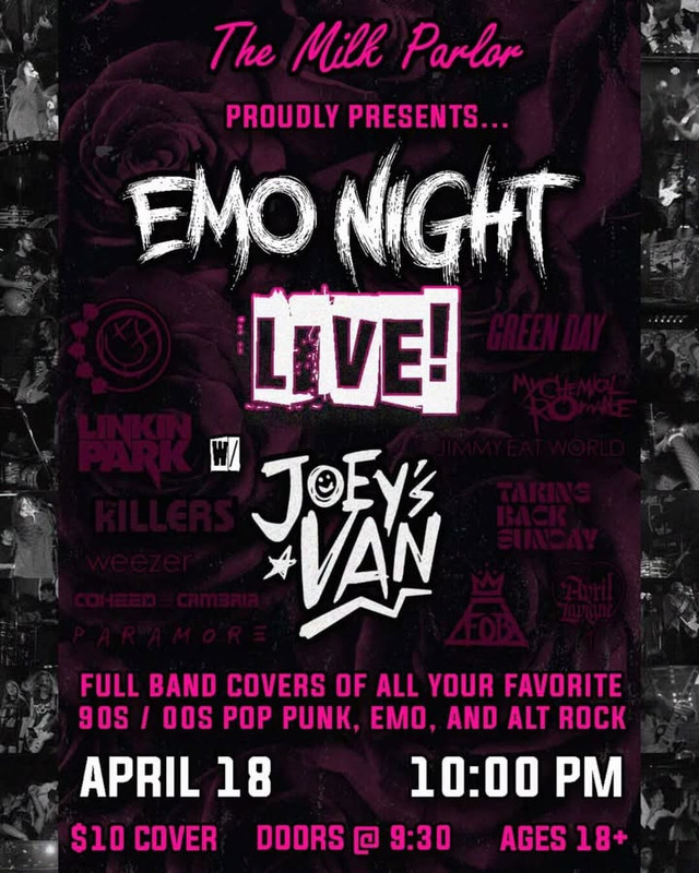 The Milk Parlor presents an Emo Night with Joey's Van in concert on Saturday, April 18, 2026.