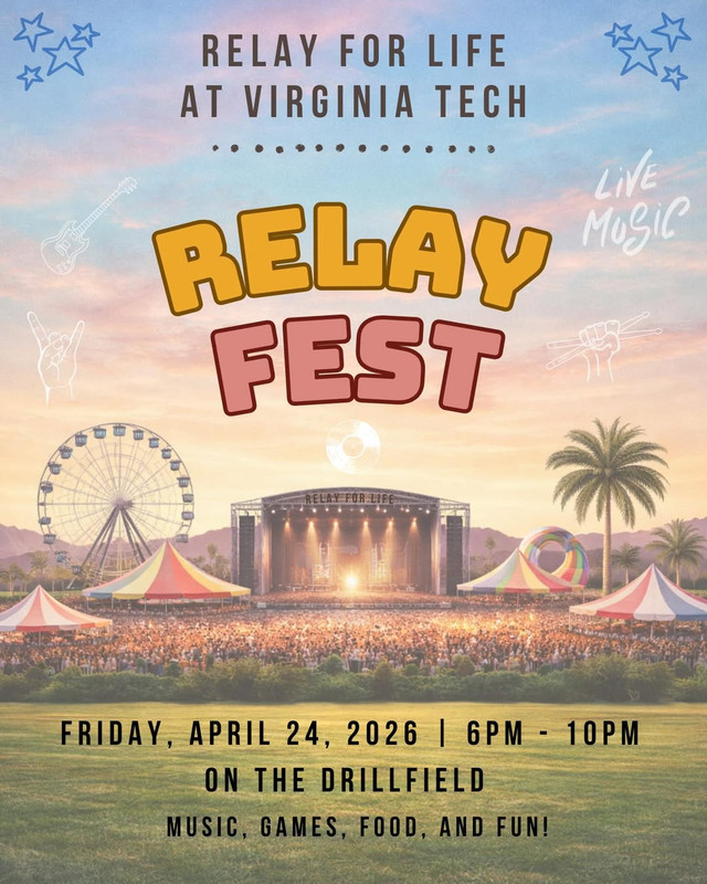 Virginia Tech Relay For Life presents their 2026 Annual Event titled Relay Fest on Friday, April 24, 2026 on the Virginia Tech Drillfield.