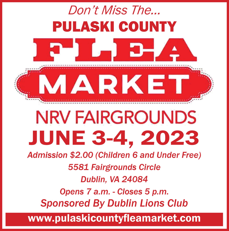 The Dublin Lions Club presents the 2023 Pulaski County Spring Flea Market on Saturday, June 3, 2023 and Sunday, June 4, 2023 at the New River Valley Fairgrounds in Dublin, VA.