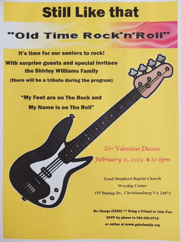 It's time for our seniors to rock! Good Shepherd Baptist Church in Christiansburg presents its annual 55+ Valentine's Dinner Show. This year's theme will be "Still Like That Old Time Rock'n'Roll". Enjoy an evening of live music, good food and lots of fun! And, bring your special Valentine!